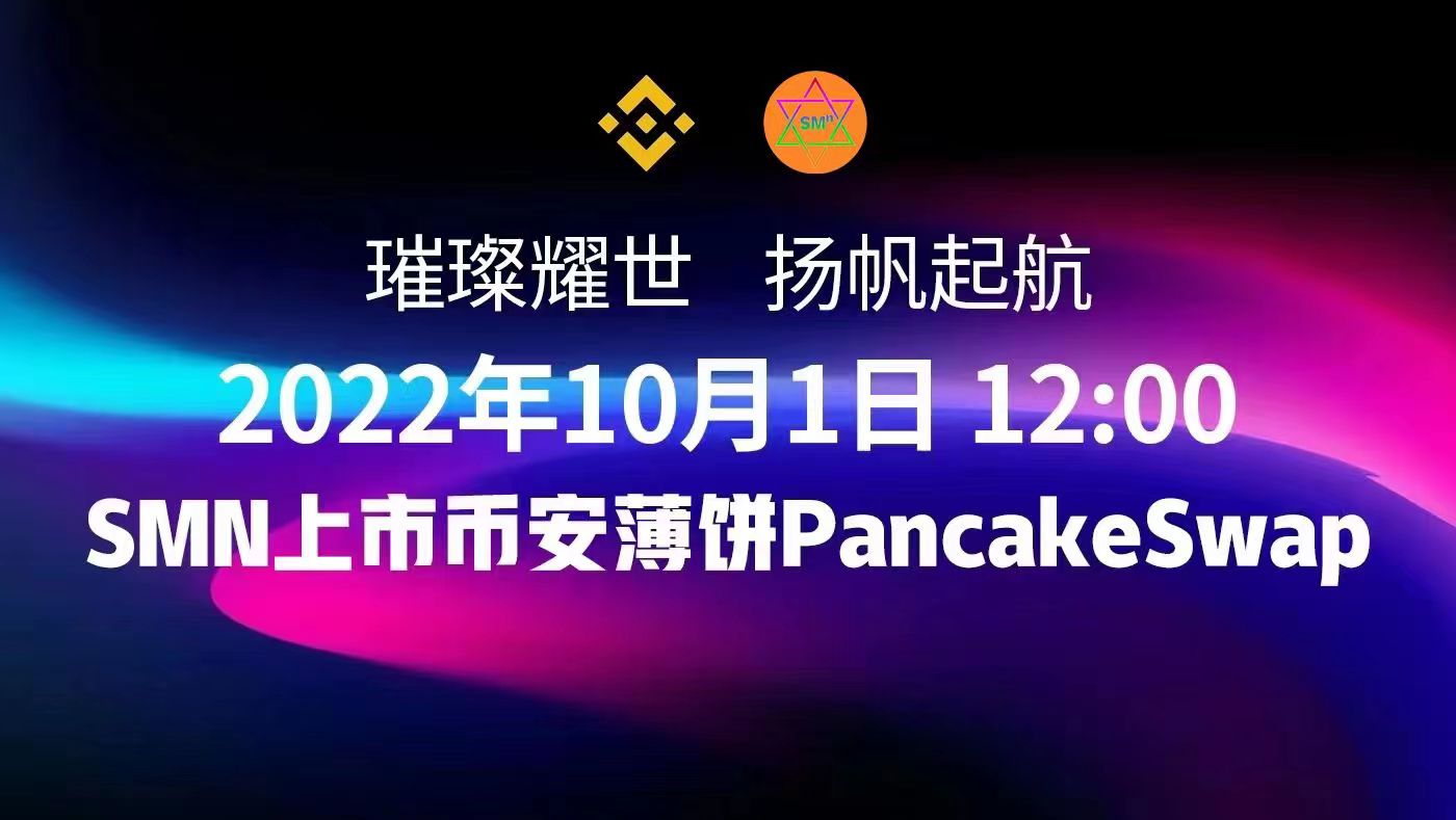 SMN公链于2022年10月1日13时:13分成功上市币安薄饼PancakeSwap,上市当天涨幅超过450%,荣登BSC和AVE交易榜涨幅榜第一名。 SMN公链将在全球DAO社区自治高度共识信仰布道之下,同频共振、联合做市,结合LP6和POT交易证明算力铸币机制的双核引擎永续推涨,稳扎稳打,坚定实现SMN公链万亿市值。