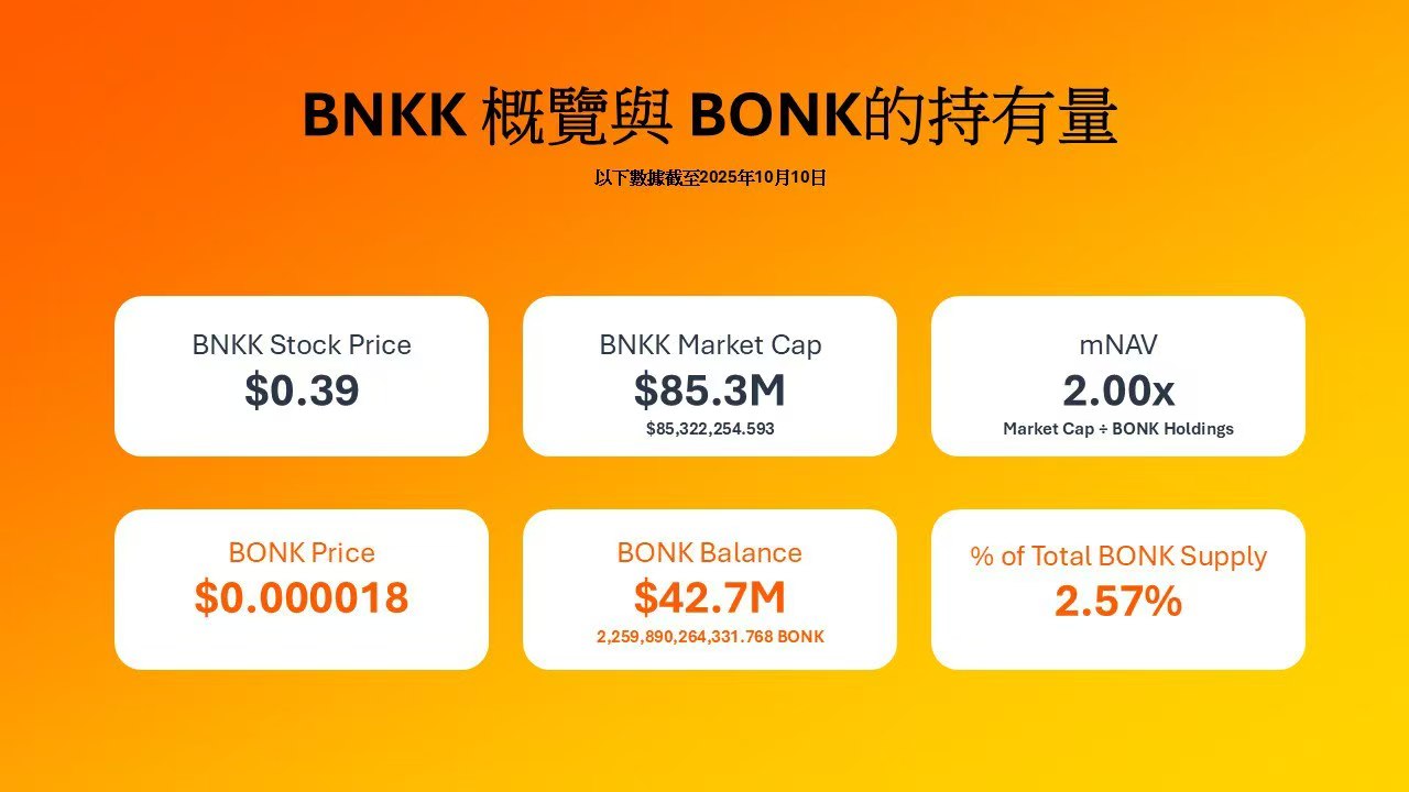 作为其战略的一部分,Bonk Inc. 的目标是持有 1.1 亿至 1.2 亿美元的 BONK 代币。截至今天,公司已实现这一目标的 51%。在接下来的两个月里,BNKK 将推出两款额外的创收产品,旨在加速 BONK 的积累,预计将增加每股持有的 BONK 数量,为投资者创造更大的上涨潜力。